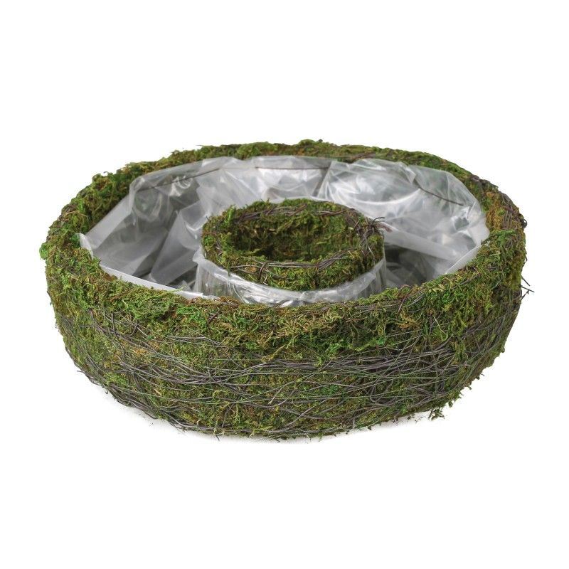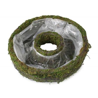 Duży kosz do obsadzania z mchu to doskonała propozycja na wiosenne stroiki i dekoracje do domu. Kosz w kształcie opony — z pustym wnętrzem, które można wykorzystać na przykład do umieszczenia wazonu z żywymi kwiatami lub dekoracji ze świecami. Wykonane z folii wnętrze kosza z mchu umożliwia bezpośrednie sadzenie w nim roślin, takich jak hiacynty, szafirki, bratki czy narcyzy. Duży kosz do sadzenia roślin wykonany jest z mchu i gałązek, a całość wzmocniona metalowym stelażem. Dzięki temu idealnie nadaje się do ogrodu, na taras, balkon, a także do wnętrz. Stanowi wyjątkowe uzupełnienie wiosennych dekoracji.